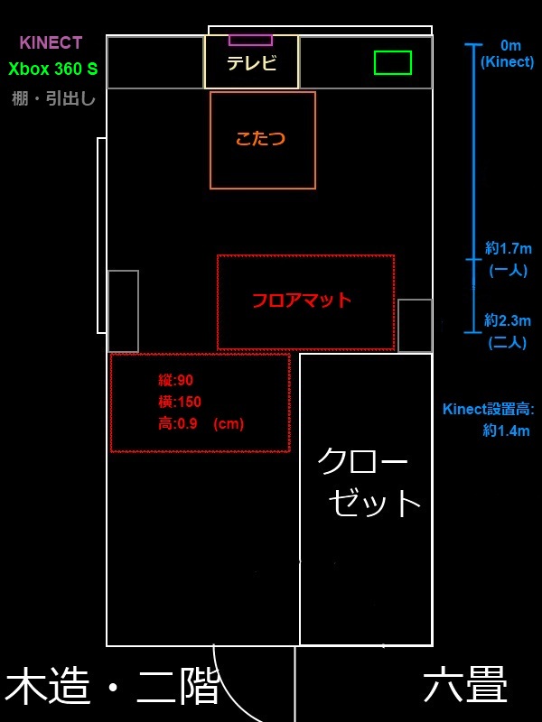 右側の青で書かれてるのがKinectを設置した高さと、一人や二人でのゲーム時の距離。
