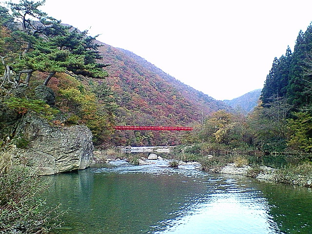 大きな赤い橋の右奥に山が折り重なって出来た渓谷の姿が見える。