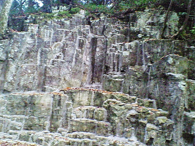 こんな岩肌を右手にして、左手に柵・・・柵の向こうは崖と川。
